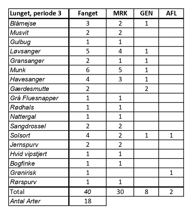 Lørdag den 7.8 blev det til 24 fugle fordelt på 13 arter på Lunget. Efter regn om natten, var der en næsten helt vindstille morgen, hvor solen kun netop trængte igennem. Resultatet blev 24 fugle, (4 genfangster), årets første Korttået Træløber, og hele 3 acro'er, der ellers hidtil har været lidt fraværende i år.